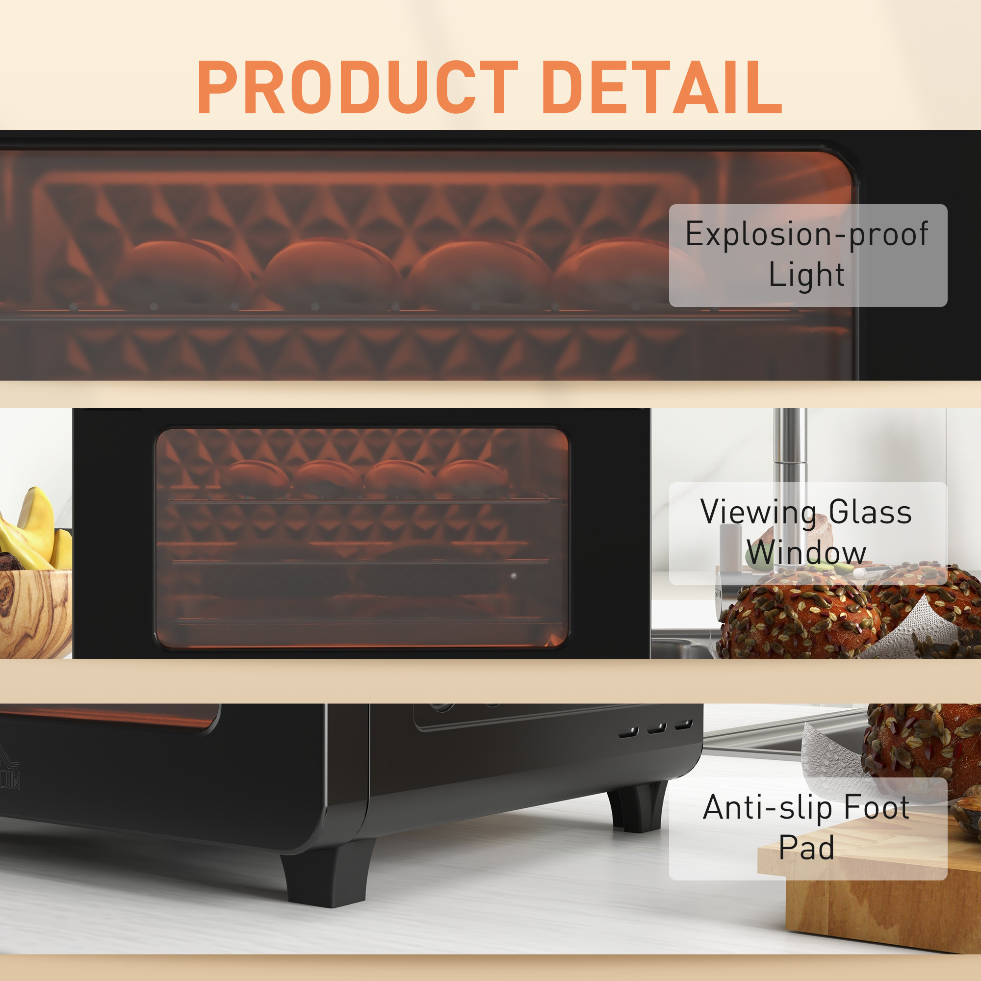 - A double-layer glass door and a tray handle for safety usage, crumb tray for easy cleaning