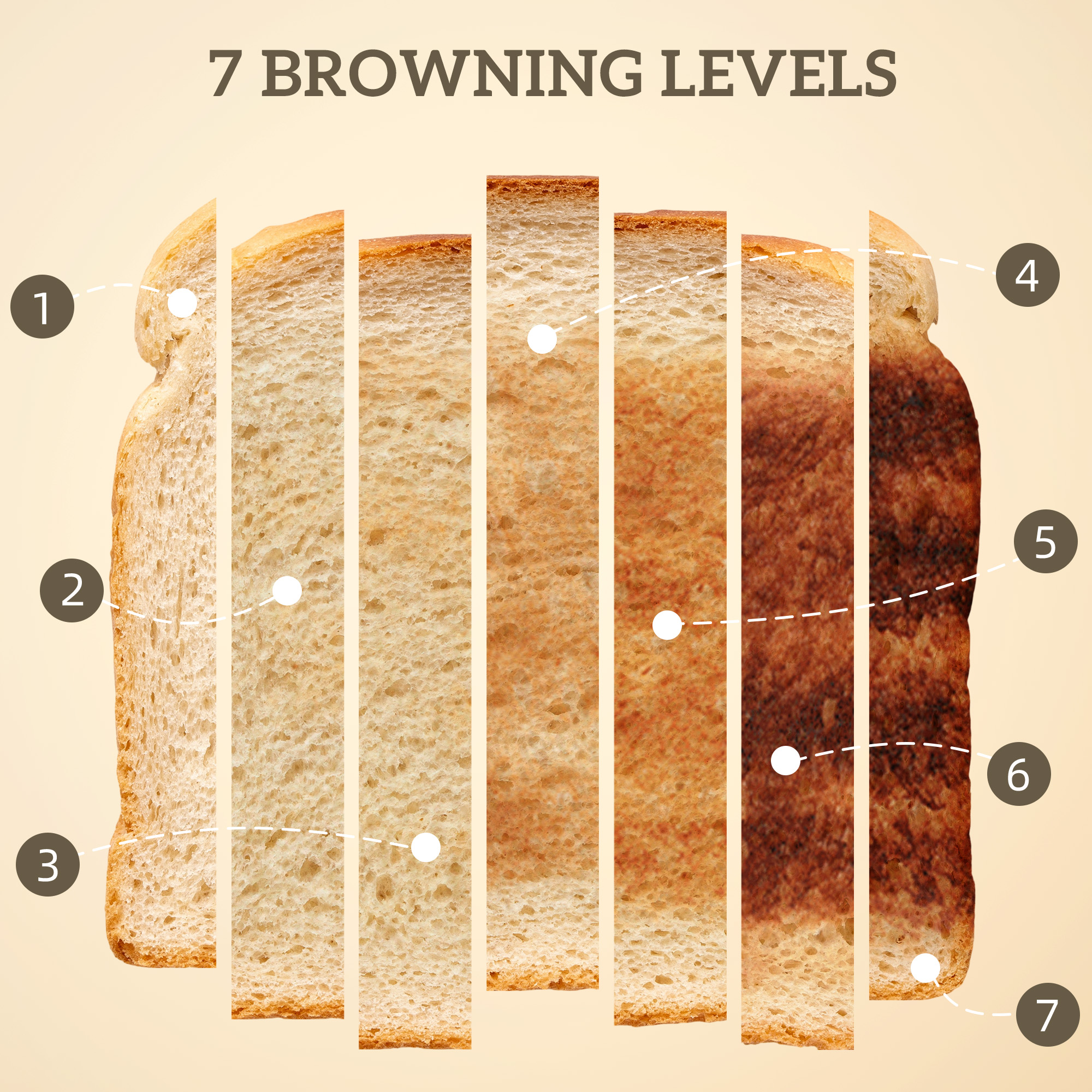 - Four-slice toast has seven browning levels. Defrost, reheat and cancel